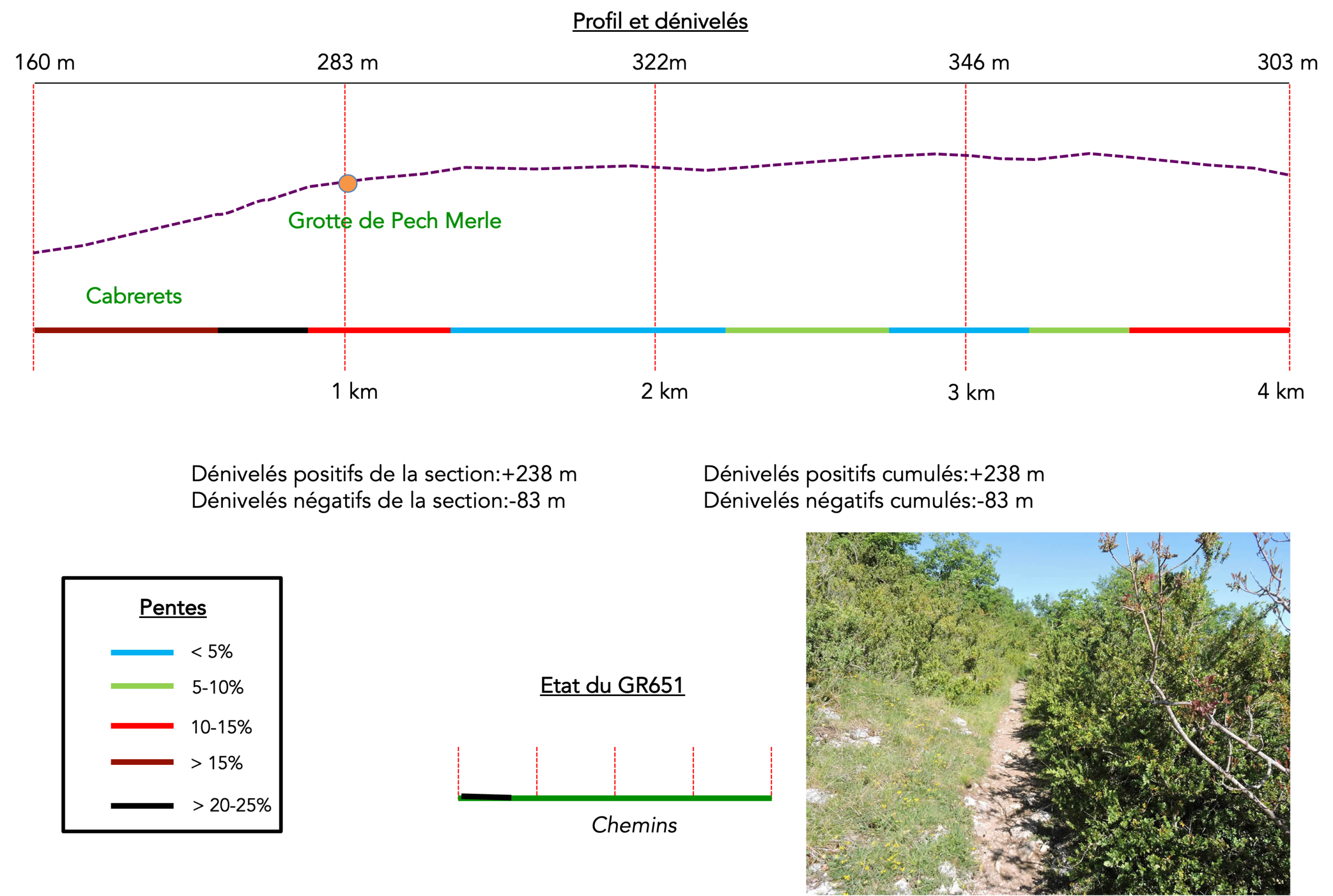 Difficulté du parcours : Certes, c’est une étape très courte avec peu de dénivelés (+443 mètres/-362 mètres), mais il y a deux passages assez exigeants, d’abord la montée à Pech Merle, sévère, et la montée à St Cirq-Lapopie.