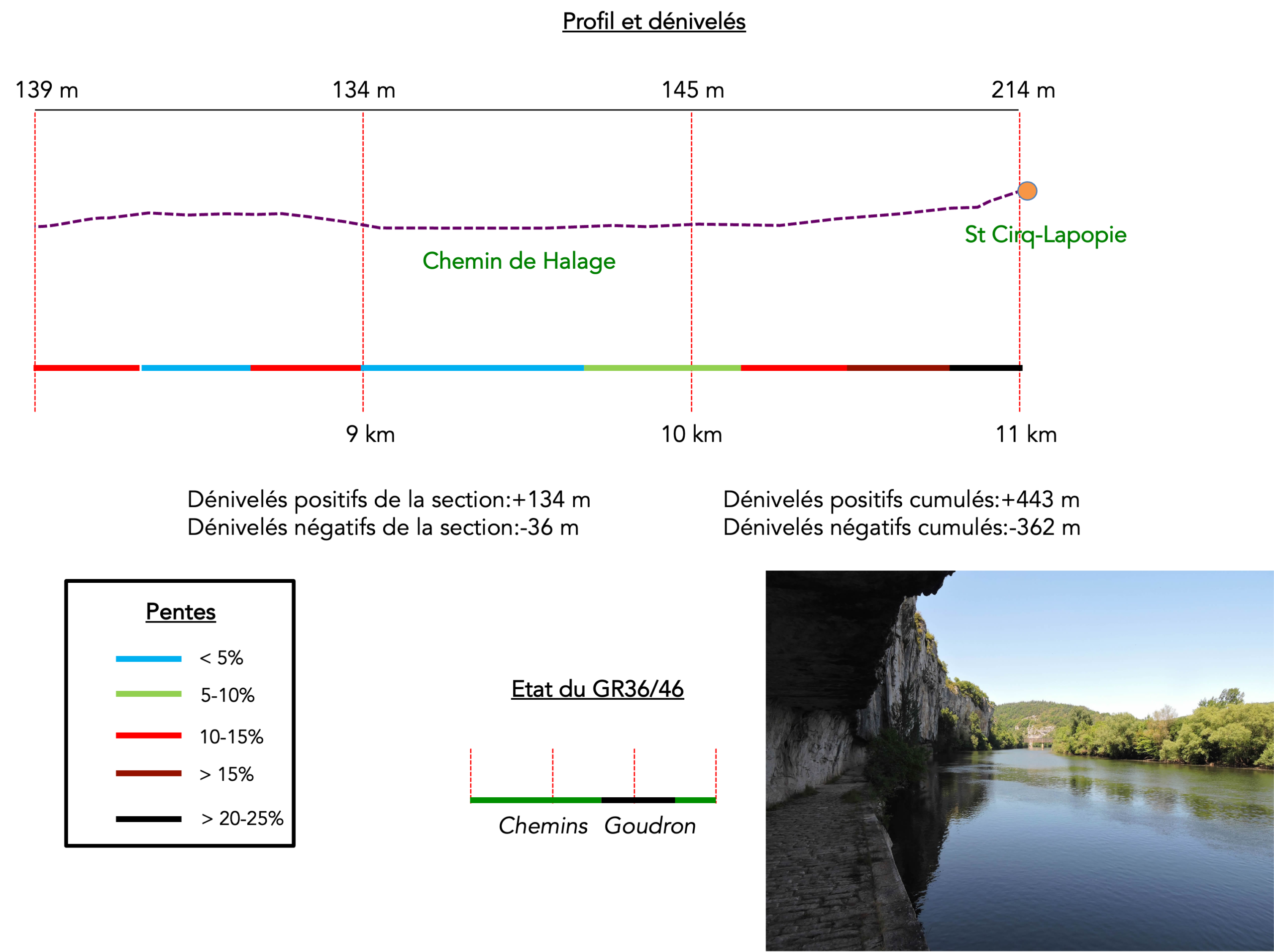 Aperçu général des difficultés du parcours : balade jusqu’à la montée sévère vers St Cirq-Lapopie.