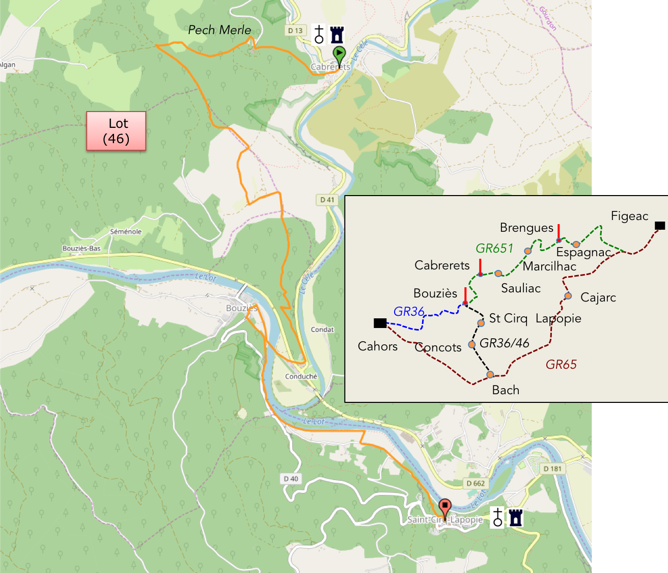 Le GR651 se termine ici. Vous allez quitter la vallée du Célé pour d’autres horizons. Comme nous l’avons dit en introduction, nous allons passer par St Cir-Lapopie et ne pas suivre le parcours direct vers Cahors. C’est alors le GR36/46 1ui prend le relais.
