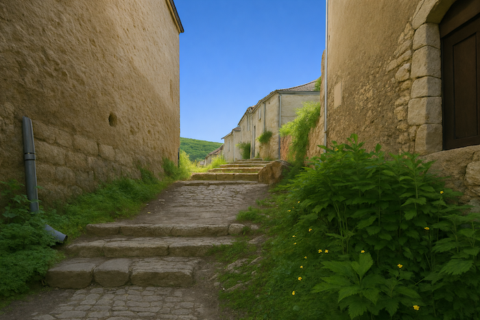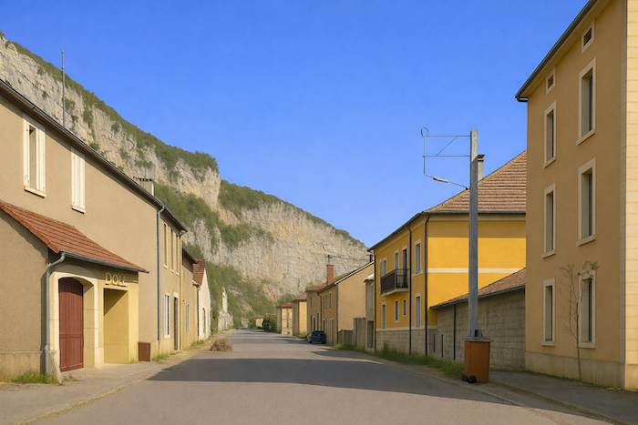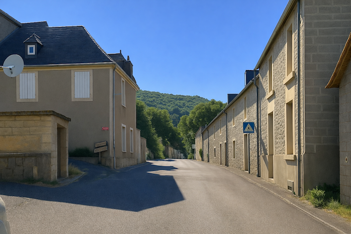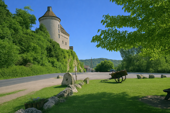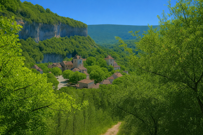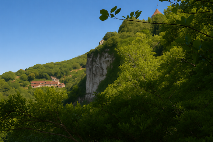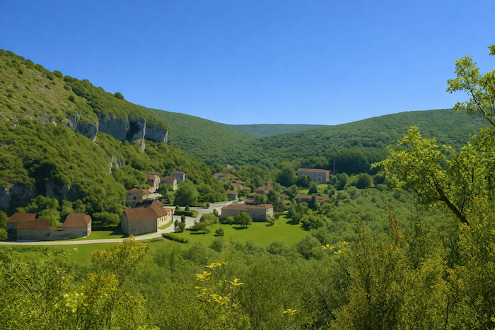 La vue se porte sur les environs mieux qu’on peut le décrire. Lorsqu’on monte dans le sous-bois, on jouit d’une belle perspective. On aperçoit le village en bas adossé au bois touffu. La vallée fait comme un amphithéâtre, coincée entre des falaises de deux côtés du village. L’horizon est fermé par les forêts qui se prolongent au-delà des collines. Chaque tournant révèle un tableau nouveau : les couleurs s’entrelacent, l’ombre et la lumière dansent sur les pierres et le feuillage. La vallée, en amphithéâtre naturel, enferme le village comme une scène, tandis que les forêts au loin s’étendent, mystérieuses et profondes, gardiennes silencieuses des secrets du temps.