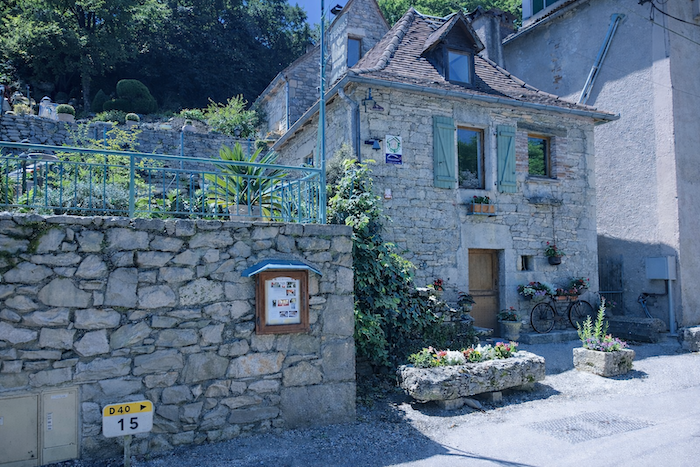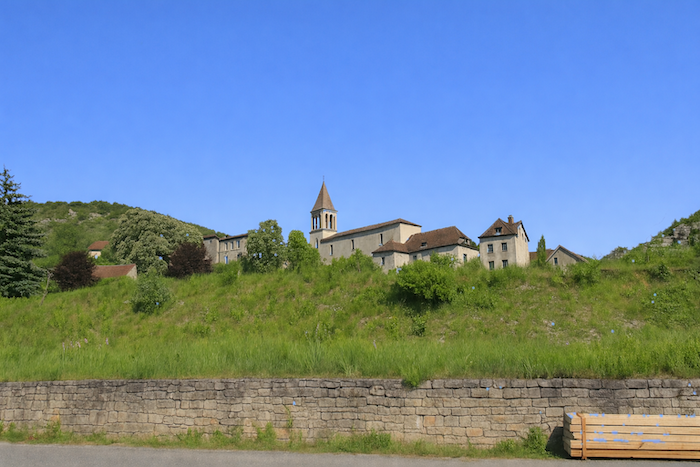 Le centre du village de Cabrerets n’est pas au bord de la rivière, mais un peu plus haut sur la colline, près de l‘église. Une route goudronnée y mène, serpentant doucement sur la colline.