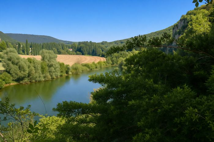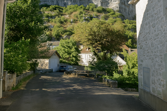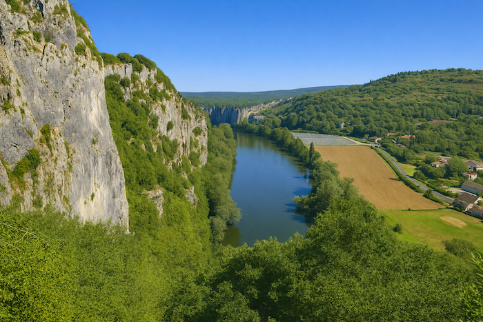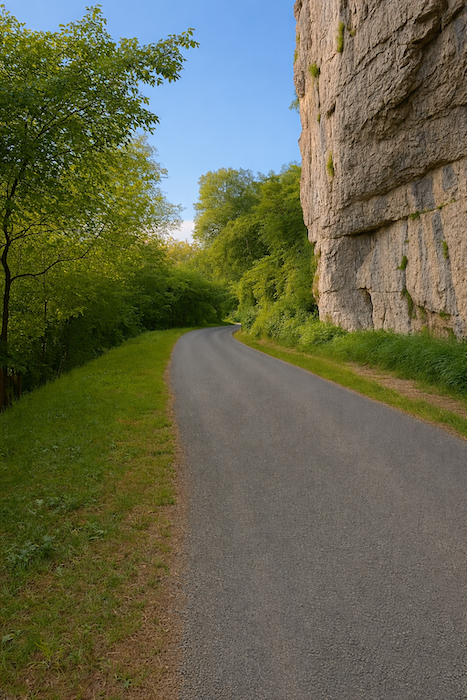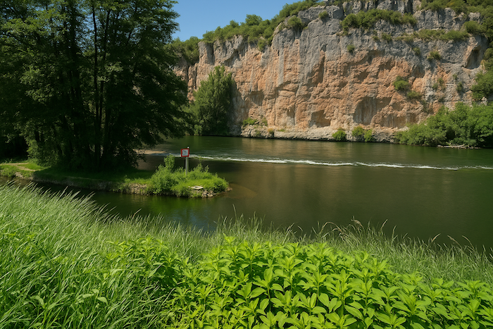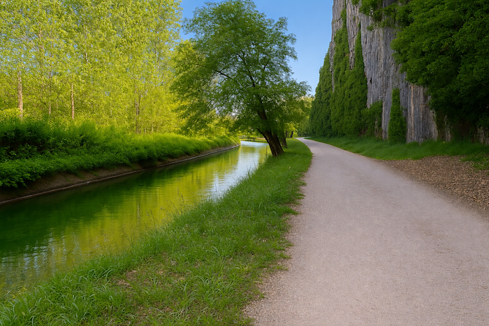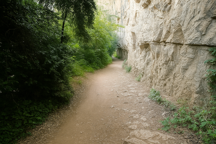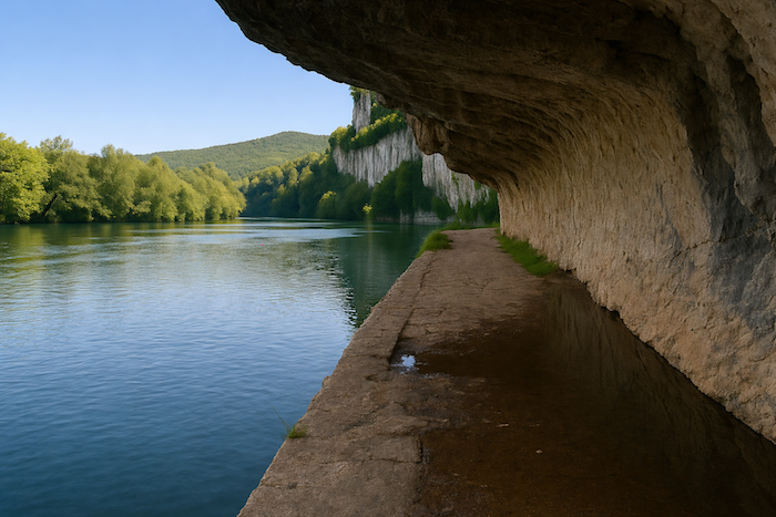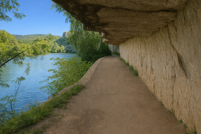 Le chemin s’enfonce un instant dans le sous-bois, longeant la rivière dans un silence humide. Puis, peu à peu, la falaise s’approche, dressant devant le marcheur sa muraille calcaire, éclatante sous la lumière.