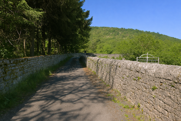Rapidement, la voie de chemin de fer arrive sur le pont au-dessus du Lot. Il y a toujours sur le chemin des endroits où la magie opère. Celui-ci fait partie des hauts-de-gamme dans le registre. Les pieds sur les poutres de chênes qui pourrissent doucement au milieu des enchevêtrements de ferraille, laissent au piéton le temps de se perdre dans le spectacle inoubliable du Lot qui coule lentement, inlassablement, comme le dit la chanson. Cette eau verte, placide, qui tranche avec la rouille du pont, c’est un peu comme le sourire des enfants qui rend la vie plus belle.