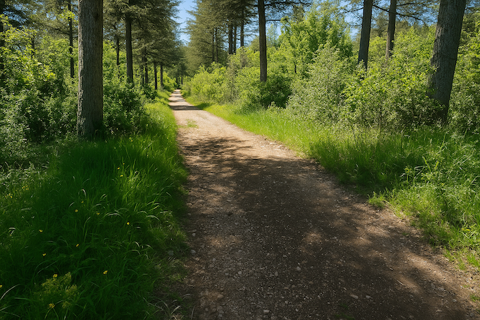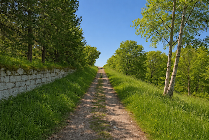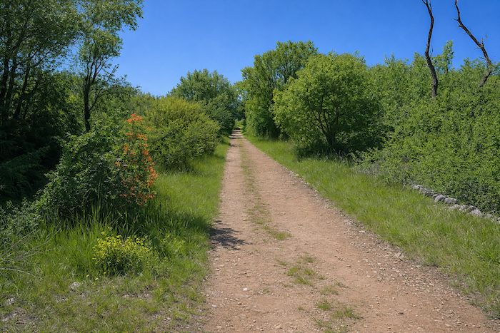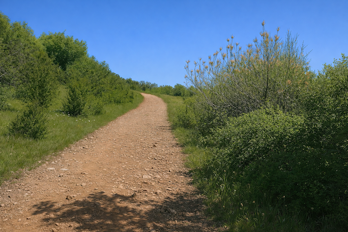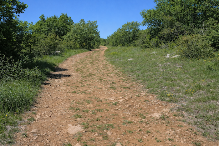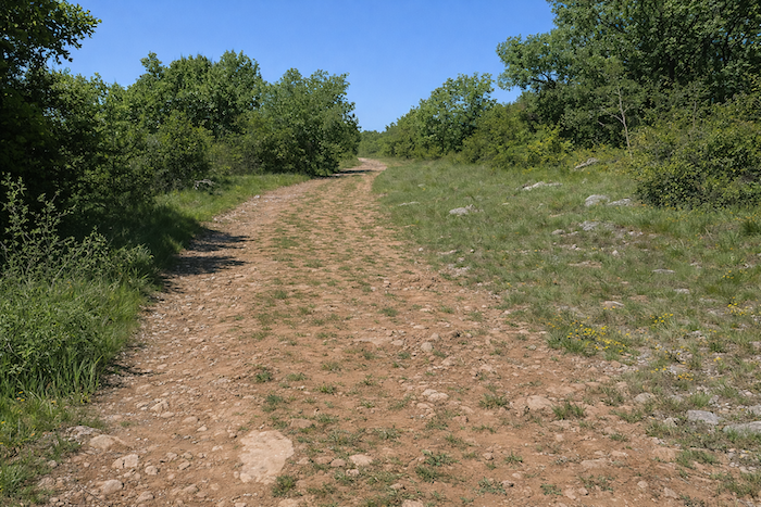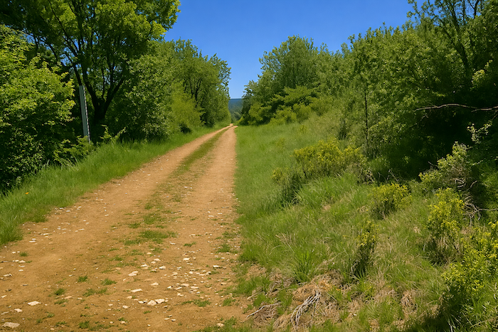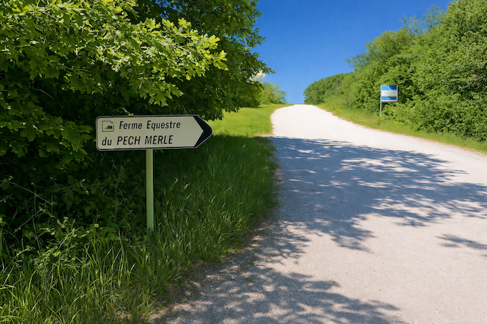 Le GR651 traverse sur le goudron les parkings de la civilisation au-dessus des grottes, pour rejoindre le causse. C’est la direction de la ferme équestre. Le parcours suit pendant près d’un kilomètre la route de gravier vers la ferme. La transition entre la foule et la nature se fait en douceur : les parkings cèdent la place au gravier, le goudron s’efface comme un rideau, et le regard retrouve l’espace, le vent et le chant des oiseaux. Le causse s’annonce, vaste et ouvert, promesse de silence et de liberté.