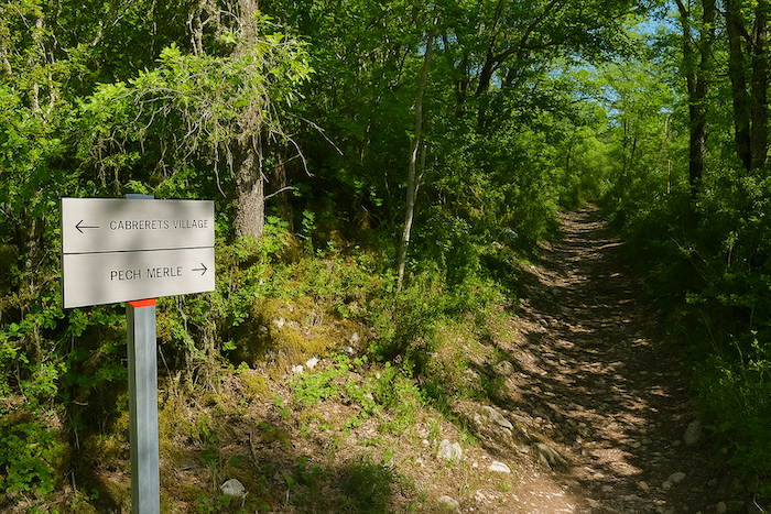 Alors, en guise d’hors-d’œuvre, voici un petit raidillon pour gagner le cimetière au sommet du village. Le site de Pech Merle est à moins d’un kilomètre d’ici. La montée se fera sur un sentier étroit et sauvage, comme un trait d’encre sur la colline.
