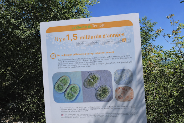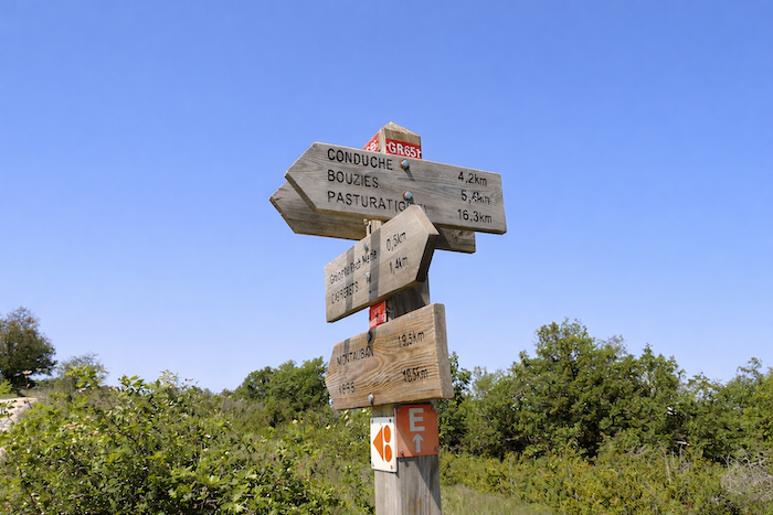 Le chemin s’élance dans la lande, serpentant entre herbes et buissons, et l’horizon s’élargit progressivement. Chaque pas semble plus léger, porté par la beauté simple et sauvage de la campagne. Un magnifique et très large chemin de terre caillouteux qui ondule et serpente dans la lande va nous accompagner presque jusqu’à Conduché, dans la plaine. Le GR651 épouse sur un tronçon un sentier didactique nommé “Chemin du Temps“. Il est parfois bon de se faire raconter l’univers en pleine nature. Le chemin, large et caillouteux, devient une invitation à la rêverie. Il serpente comme un ruban de lumière à travers la lande, et le “Chemin du Temps “ murmure les histoires du monde, révélant la géologie, la flore et les siècles enfouis sous vos pieds. La nature, ici, devient professeur et guide.