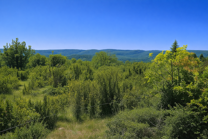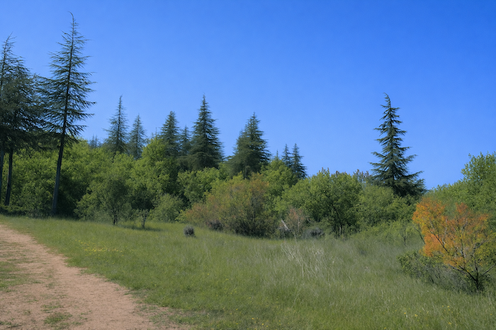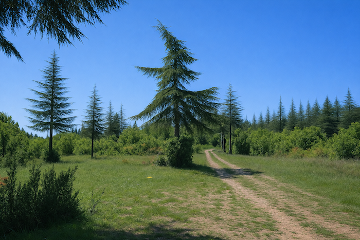 Le chemin longe alors la crête. Il monte et descend, en douceur, dans un tourbillon de couleurs. La terre rouge tranche sur le vert des buis, aux couleurs vives, aux branches basses, aux troncs torturés, parfois crevassés, qui font des arabesques savantes. L’horizon est barré par la profondeur des forêts qui s’étalent dans la ligne ondulante des collines. Chaque crête révèle un tableau changeant, une symphonie de tons et de textures. Le rouge vif de la terre contraste avec le vert sombre des buis, tandis que les arbres, torturés par le temps, composent des arabesques qui semblent dictées par une main invisible. La profondeur des forêts en arrière-plan offre une sensation de mystère et d’infini, et l’âme du promeneur s’y abandonne avec délice.