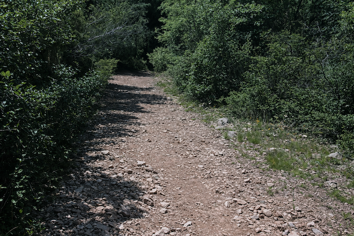 Peu après, le chemin change de registre pour quelques centaines de mètres. Le chemin, de lisse se transforme en un champ de cailloux ocre dans une végétation plus exubérante.