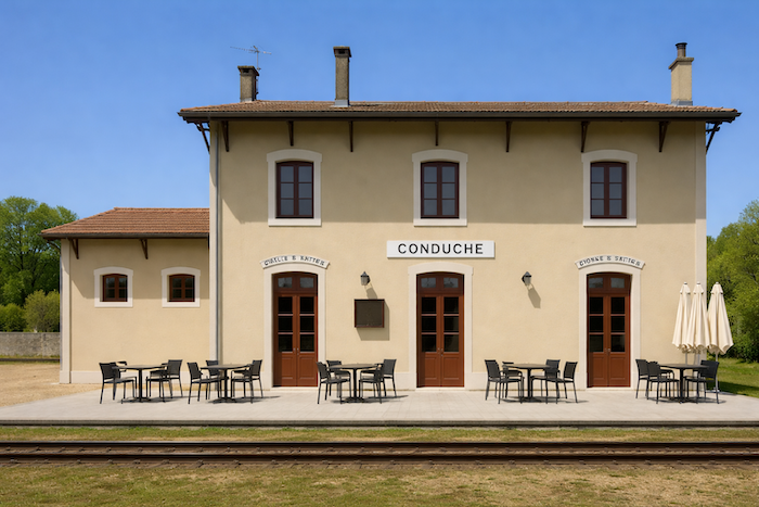 Le chemin, à la sortie de la forêt arrive à la gare de Conduché, dans la fraîcheur du vallon, dans la plaine. Conduché fait partie de la commune de Bouziès. Conduché faisait partie du réseau ferroviaire reliant Cahors à Decazeville. La ligne a été définitivement fermée au trafic en 2011. La gare a été transformée en gîte.