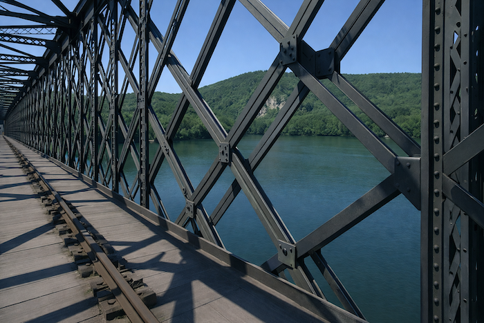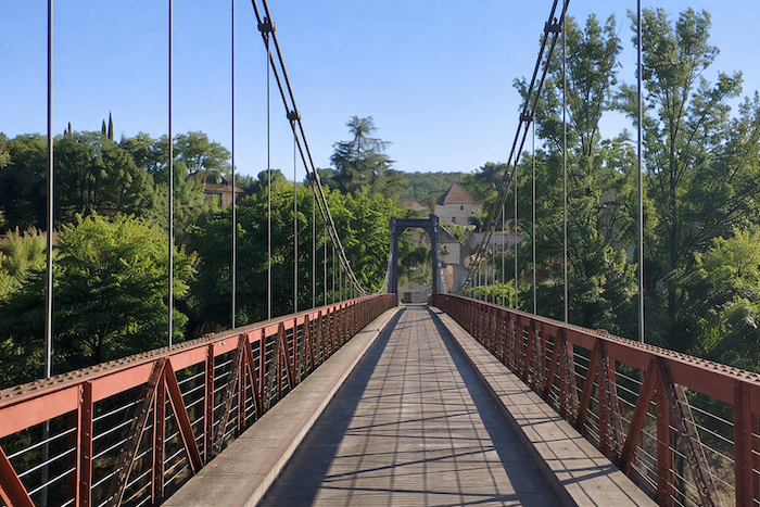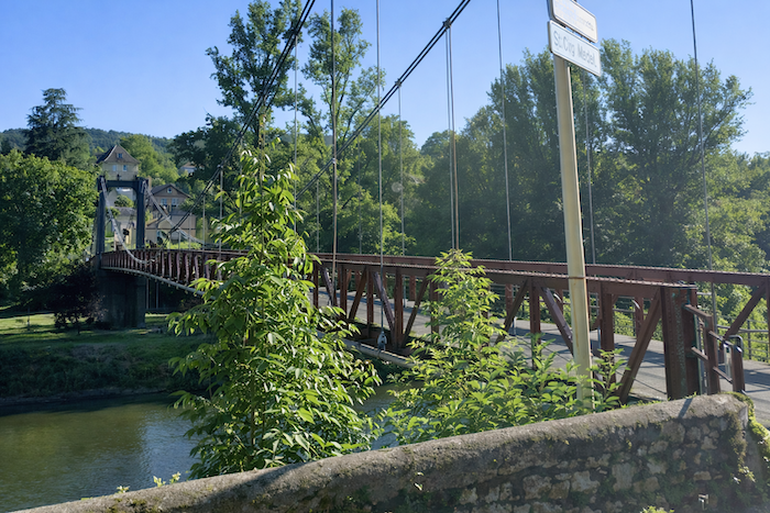 Sur un pont de fer, le parcours passe sur la majestueuse rivière, direction Bouziès.