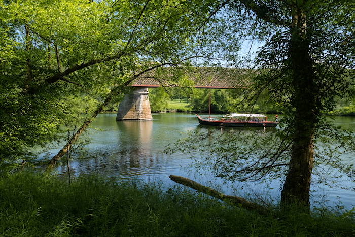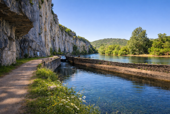 Quatre kilomètres à peine séparent les deux lieux, mais quel voyage ! Un petit chemin de terre s’élance à plat, suivant docilement le cours du Lot. Il passe sous la vieille voie ferrée, celle-là même que vous auriez peut-être foulée avez foulée en bravant les buissons depuis Conduché sur le rail, comme si le passé lui-même se penchait pour saluer les marcheurs d’aujourd’hui. Le Lot, ici, est navigable. Les eaux y glissent lentement, portant au fil des heures les reflets changeants des falaises et des nuages. De petites croisières, paisibles et joyeuses, remontent ou descendent le fleuve, traçant sur l’eau un sillage d’argent.
