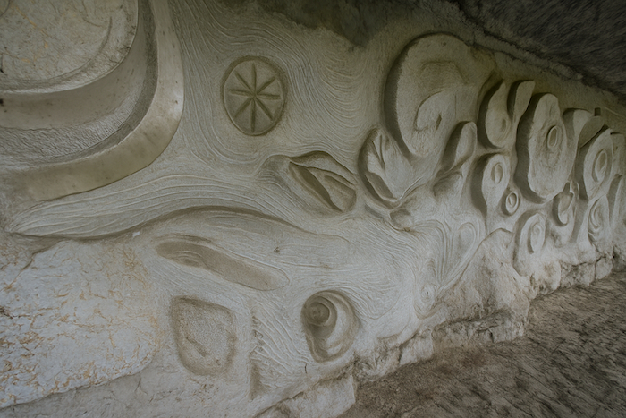 C’est ici que Daniel Monnier, sculpteur moderne, a laissé son empreinte : de grands bas-reliefs taillés dans le calcaire de la paroi, célébrant la vie fossile du lieu : coquilles, poissons, fougères, empreintes d’anciennes marées. L’art rejoint la pierre dans un murmure minéral.