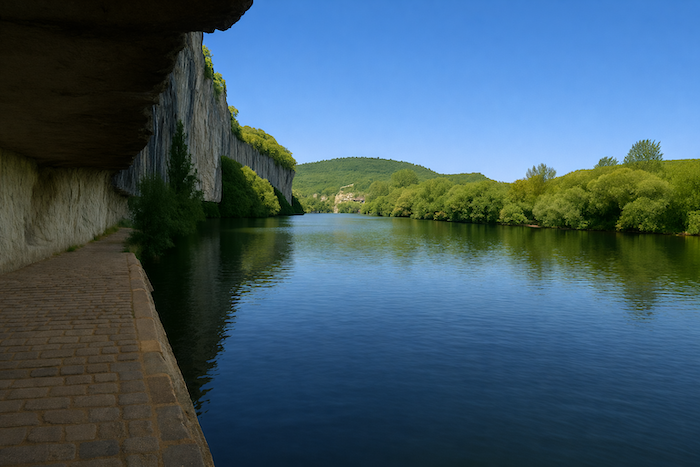 Et soudain, c’est le choc, la révélation : la rencontre prodigieuse avec les pavés lustrés du Chemin de Halage. Ils serpentent sous la falaise, épousant ses plis, ses teintes de gris, d’ocre et de bleu, jusqu’à se confondre avec l’eau elle-même. Le halage, construit en 1845, permettait autrefois aux chevaux de tirer les bateaux lourds de marchandises, vins de Cahors, robinets de tonneaux, prunes séchées. L’écho de leurs pas semble encore vibrer sous les sabots invisibles des bêtes.
